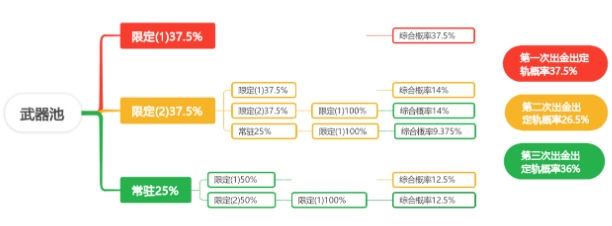 武器池的定轨机制:出金有37.5%概率出定轨武器,37.5%概率出非定轨武器,25%概率出常驻武器。出2次金如果都不是定轨武器则第三次必定是定轨武器。综合产出定轨武器在第几次出金如图所示:
