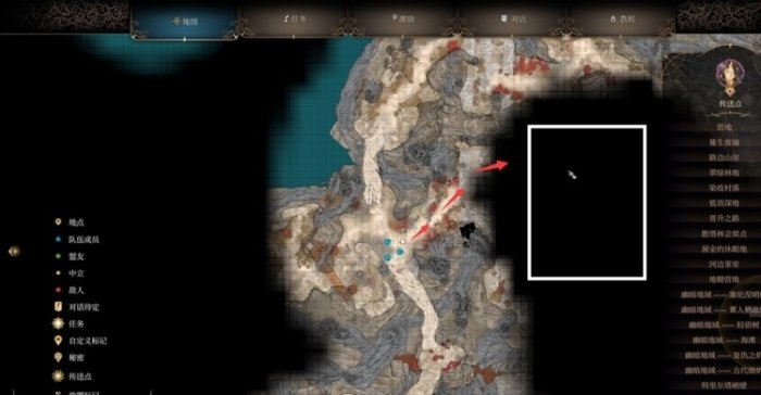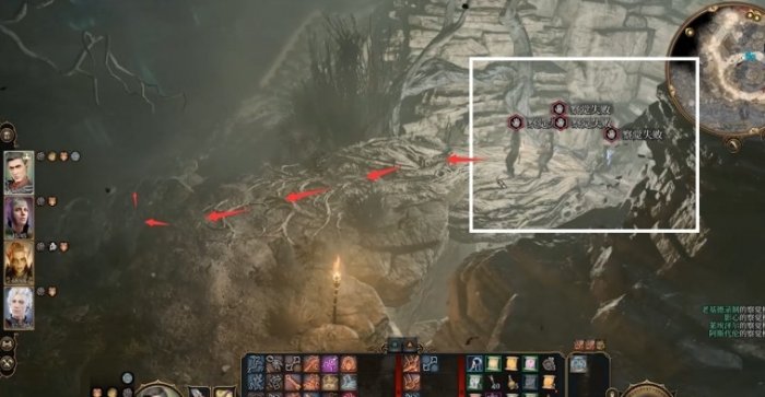 接下来沿路朝东北上方未探索区域,走到前面分叉路口沿路朝树枝藤蔓往东走,走到出现察觉检定时停下,这里即便察觉失败,通过隐匿也能看到前方怪物的视野范围。接着召唤出魔宠,对应单独隐匿,全体往前走