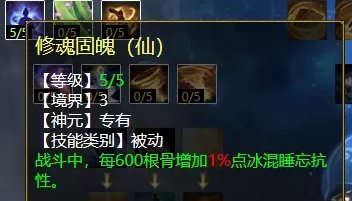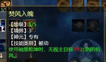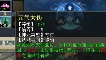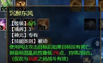 风天赋第三排三个技能,分别是:修魂固魄(任务、PK通用,在战斗中提高人法抗性),沉醉东风(PK专用,对风法没秒死的单位减抗混),焚风入魄(任务、PK通用,风法五法秒时对主目标增加忽视)