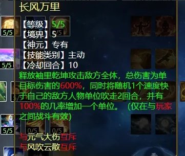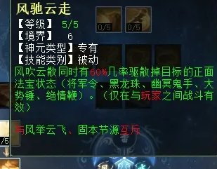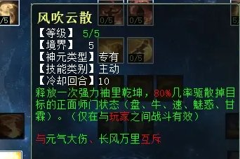 “风吹云散”有几率将对手的盘、牛、速、甘霖、魅惑吹掉,对战血队或者敏队都有极高的战术意义。第二排大招点出手,还可以几率吹掉对方的法宝状态,如将军令、黑龙珠、鬼手、绝情鞭等。