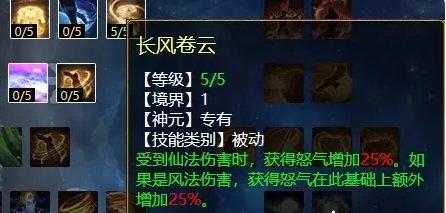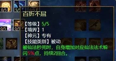 风天赋第一排三个技能,分别是:金缕衣(任务、PK通用,增加抗反震几率),百折不屈(任务、PK通用,被仙法秒死时,下回合增加该仙法躲闪率),长风卷云(任务、PK通用,受仙法伤害可增加更多怒气)