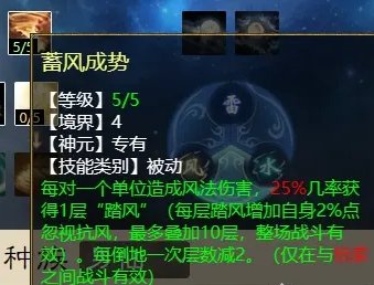 风天赋第四排有四个技能,后面两个技能互斥,只能选其中一个,它们分别是:凝神入魄(任务、PK通用,使用任意仙法五法秒,都可对主目标增加忽视),花开见佛(PK专用,风法秒死BB可增加下回合的忽视),临战追风(PK专用,每回合开始前几率获得1层“踏风”状态),蓄风成势(PK专用,风法秒到的单位越多,获得越多“踏风”层数,每倒地一次减2层)