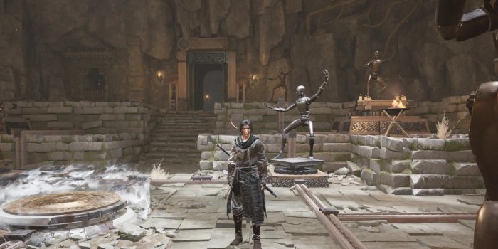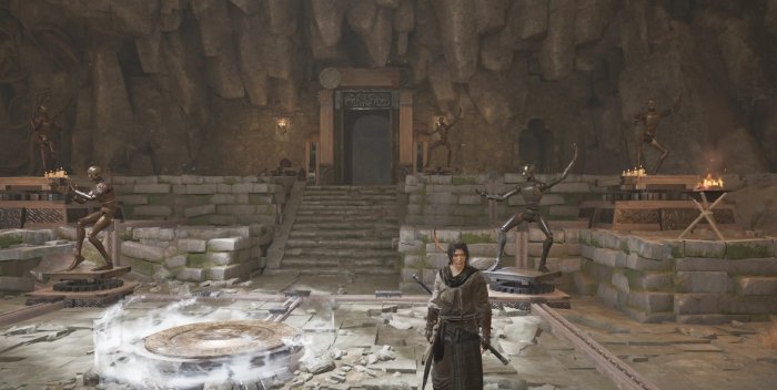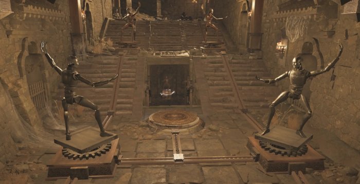 踩上第一个踩踏机关,使前面两个雕像与后面两个雕像一致,完成后离开机关,芝麻开门~