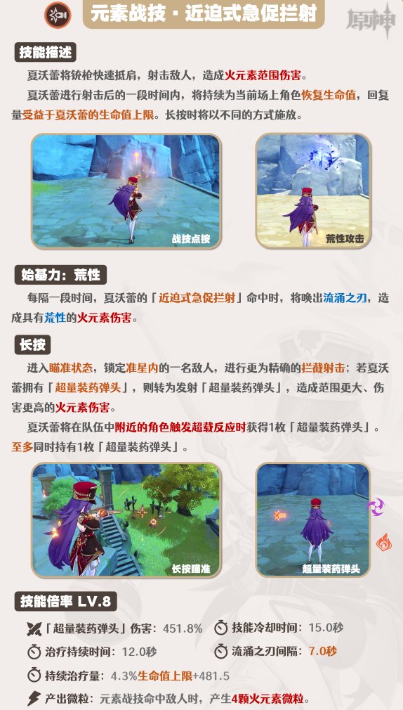 夏沃蕾的普攻、重击并不是主要输出方式,自身机制主要在元素战技、固有天赋中,这里便不再过多赘述。