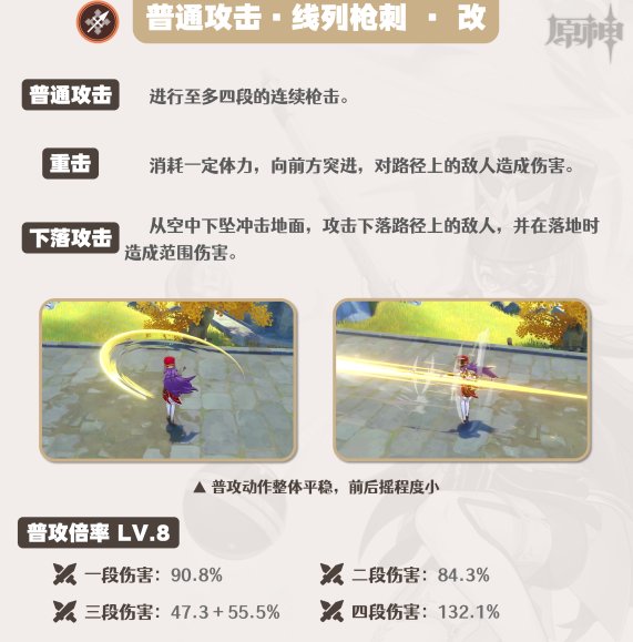 ①连续点按普攻键夏沃蕾将进行4段攻击,其中第3段攻击造成2次伤害,其余段数均造成1次伤害。重击、下落攻击与部分长柄武器角色类似。