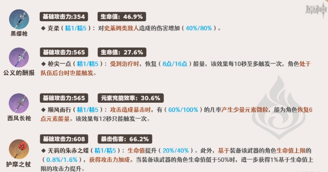 4.夏沃蕾的生命值如果堆叠至3.5W,考虑到攻击力存在不小的稀释现象,可选择「西风长枪」来丰富夏沃蕾的功能性,此时圣遗物的副词条或理之冠主词条可考虑堆叠些许暴击率,进而促进触发该武器的被动、优化队伍循环。