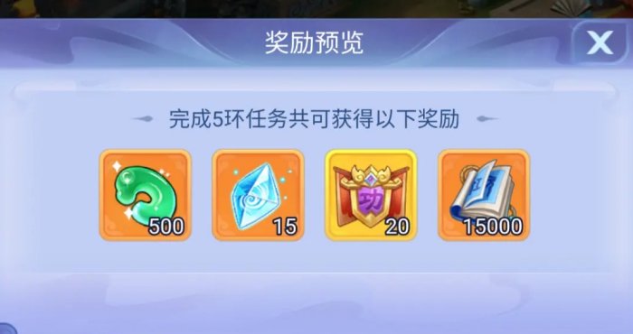 完成5环任务共可获得500仙玉、15宝石精华、20远征赛事积分、15000同盟科技点(可用于提升同盟科技)