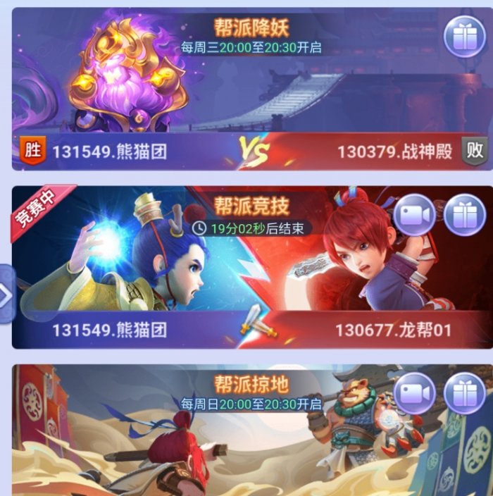 新版帮派竞技玩法,于每周五20:00~20:30开放。