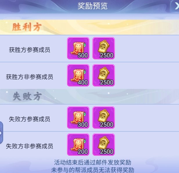 无论胜负,无论是否参赛,只要要帮派,都可获得,只胜方的参赛成员可获得奖励最多。