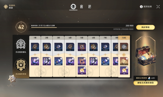 燃料的获取除了升级奖励有外,无名勋礼这里也有,普通的就有,如购买大月卡可以获得更多燃料和其他一些材料。