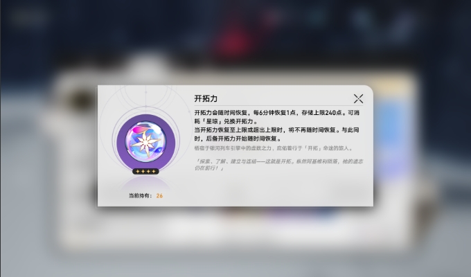 首先,开拓力也就是玩家口中的体力,开拓力会随之时间进行恢复,而且在之前的一次更新后有了“后备开拓力”。