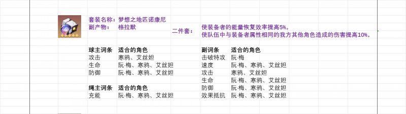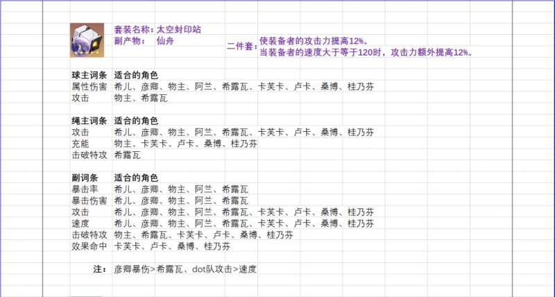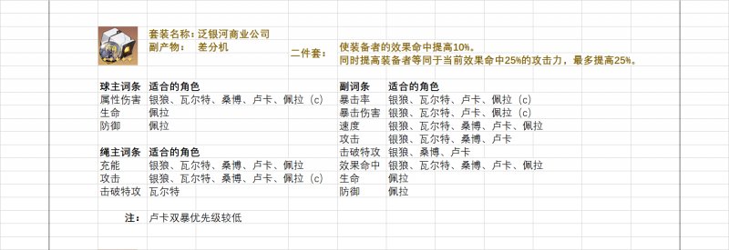 对于同一角色,排列顺序大致为优先级,例:假如某套装副词条第一行是击破特攻——阮·梅,第二行是速度——银狼、阮·梅,则银狼最需要的副词条是速度。偶尔有不能统一顺序的套装会备注例外情况。