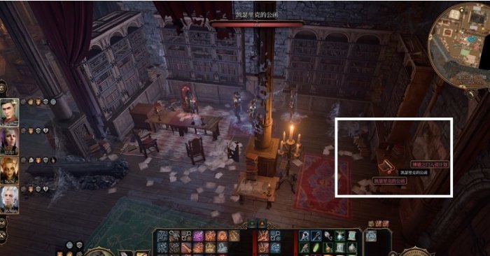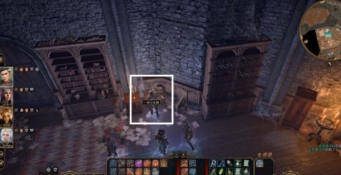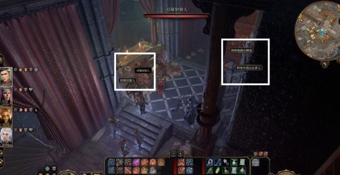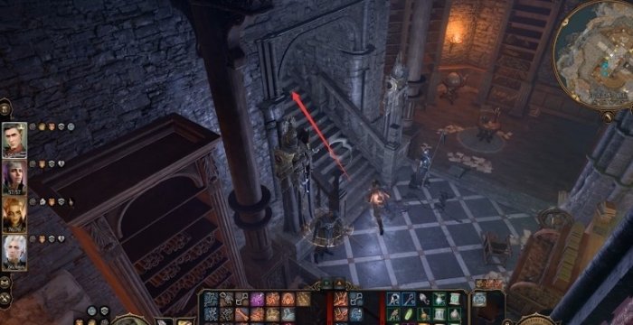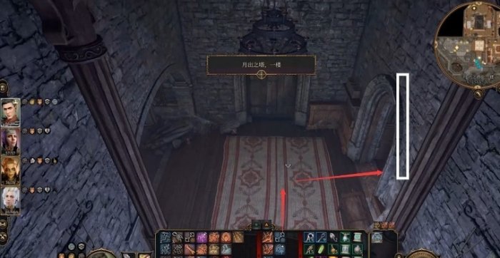 上台阶前往一楼。抵达一楼后,我们先不和左转西边的泽瑞尔等人互动。右转进入下个房间。进入后,该区域内会有个眼睛巡逻,先等眼睛进入房间,将门关上后解决了再进行搜刮