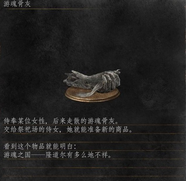 出现条件:无法在隆道尔的尤莉亚处购买才会出现游魂骨灰。(例如未接受黑暗印记导致尤莉亚不出现、杀掉安里等)