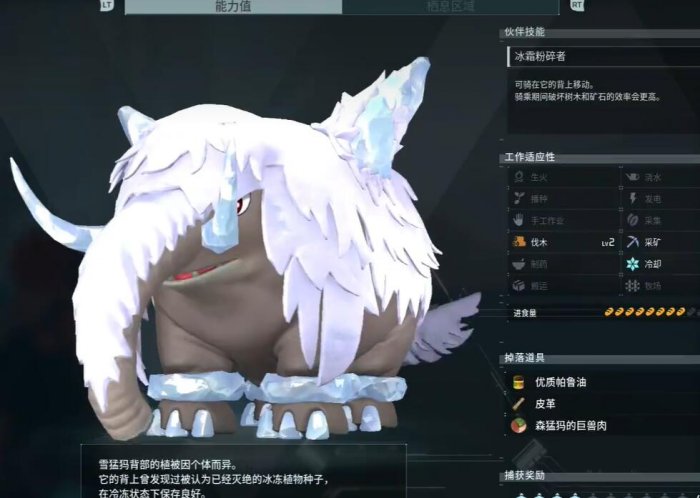 掉落物品:优质帕鲁油、皮革、森猛犸的巨兽肉