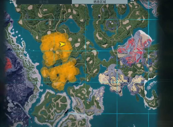 2、随后往中央位置的左下角走,如下图所标注的黄色区域,这就是佩克龙的活动范围。(白天活动型)