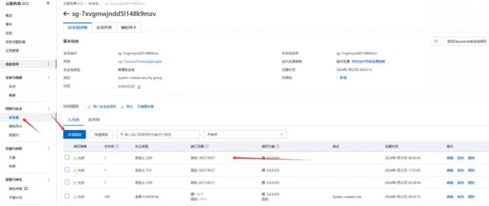 n2n用的是UDP协议的端口,所以还需要去配置一下阿里云的安全组添加一个UDP协议9527端口,这样虚拟局域网的服务端就配置好了。