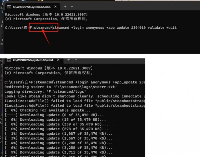 然后输入,文件的绝对路径+steamcmd +login anonymous +app_update 2394010 validate +quit