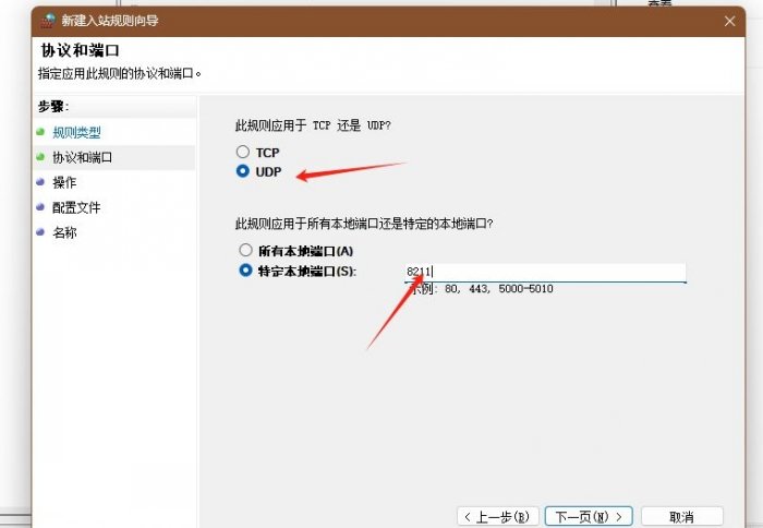 在防火墙-高级设置-入站规则-下一页,选择udp,端口号输入8211,然后一直下一页保存即可。