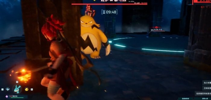 3、在完整看完boss的过场动画之后,你会发现守卫也被传送进来了,这时候守卫的攻击对象还是玩家,这就需要你依靠走位,让守卫攻击你的时候,子弹打到佐伊身上,你会发现佐伊和她的宠物会卡在柱子那边,一动不动。这时候你就可以出手了,掏出帕鲁球,直接往佐身上丢,她会立马被收服,而且还是一次就能成功的,这样你就白嫖到塔主小姐姐了。最后选择原地死亡,就可以离开高塔了。