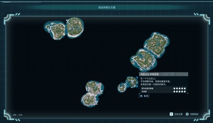 首先我们过完初始剧情都是在同一个地方复活的,那么为什么我要说前期营地的推荐,是因为我们在死亡的时候,会进入一个重生位置的选择,就可以开局直接送死去到一个你想去的地方造家了(如图)