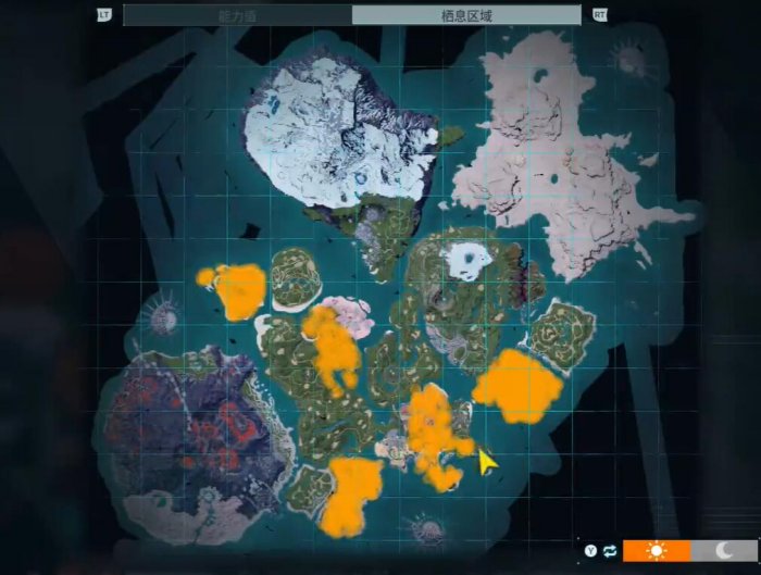 围绕在新手出生区域周围一圈,具体为帕洛斯群岛中央地带,栖息地点标注如下(白天活动常规型帕鲁)