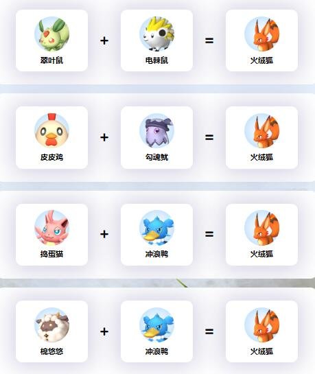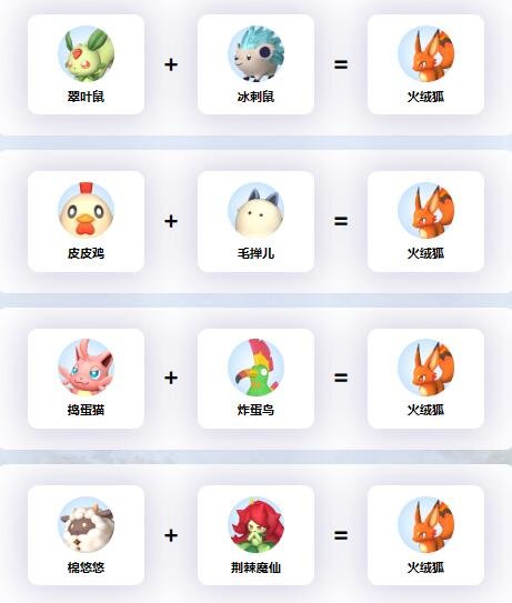 火绒狐可通过翠叶鼠 + 冰刺鼠、皮皮鸡 + 毛掸儿、皮皮鸡+勾魂鱿=火绒狐、捣蛋猫+冲浪鸭=火绒狐等方式配种培育出来。