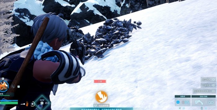 如果这时候你已经满负重了,那么就可以掏出我们第三个工具了,抓钩枪,瞄准矿堆中心,勾过去