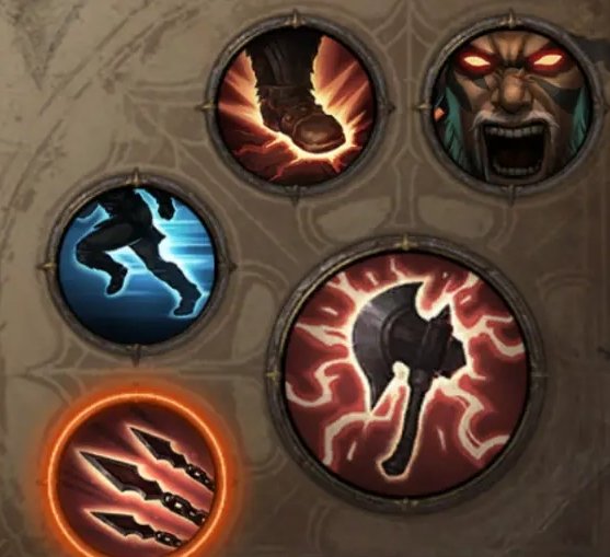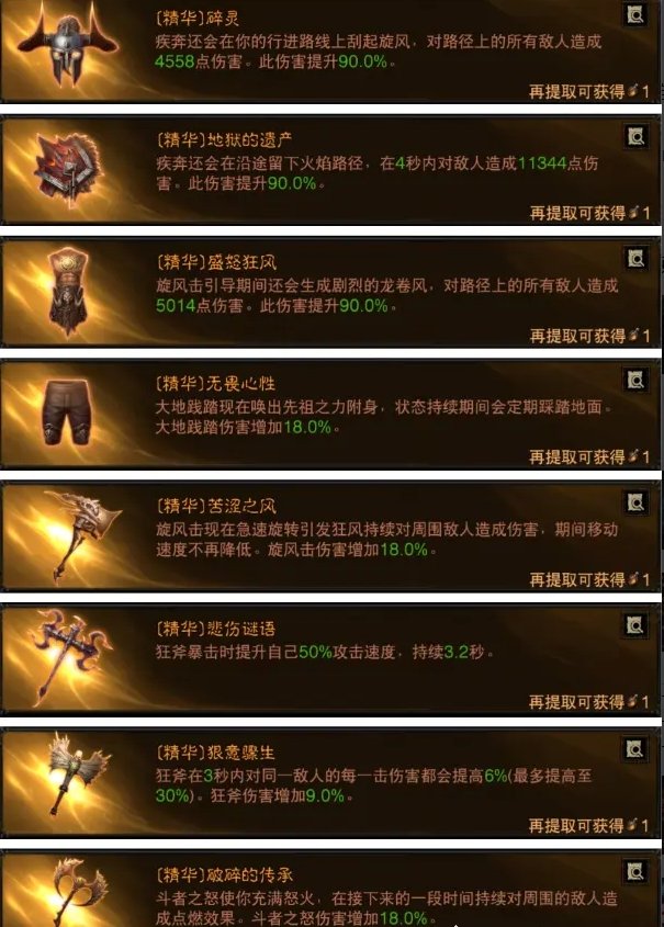 这套是野蛮人最常见的BD了,也是目前刷野打本最舒服的BD,开启疾奔全程风火跑图,疾奔带火带风、旋风击带风、斗者之怒带火,可以负责的说如果你有一定的持续时间加成全程风火助威是随便触发的。普攻选择了狂斧,主手增加攻速副手提升伤害可以说在全程AOE的BUFF下我们打BOSS也依然有一战之力!