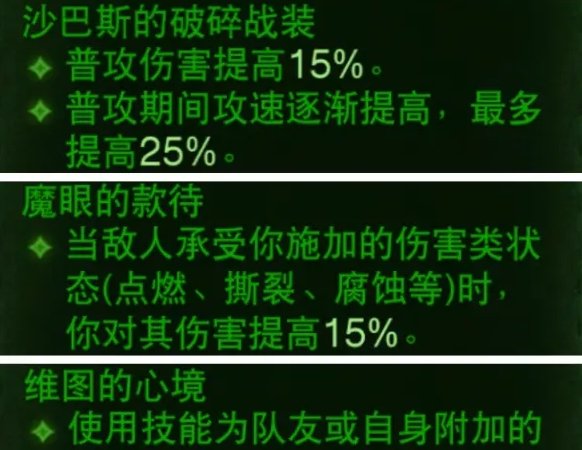 普攻流推荐4沙巴斯把攻速和普攻伤害作为核心,其次魔眼给到负面状态伤害提高15%,维图给疾奔、斗者之怒、大地践踏3个技能提升持续时间,2维图还是最重要的,因为疾奔都斗者之怒的技能时间决定了我们输出的上限。