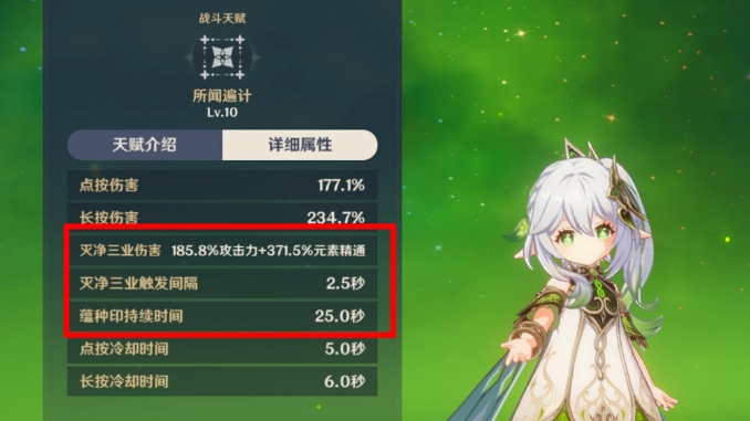 这里友情提示:虽然我们都知道精通是纳西妲最重要的属性,但其实攻击力和元素增伤和暴击爆伤都是有用属性。