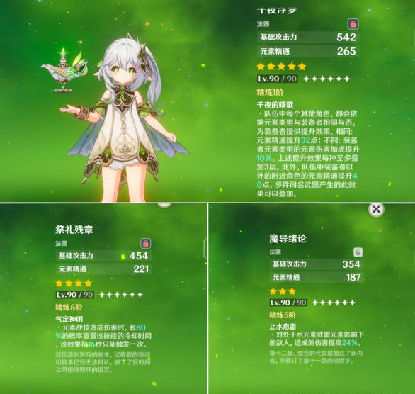 千叶浮梦(专武)获取难度很大;增加精通和元素伤害,一看属性就是为小草神量身打造。此外该武器还能给队友提供40点精通,有一定辅助能力。