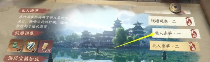 第二个需要大家打开游历,点击【凤雅宋】,完成【北人南笋 一】就会获得。