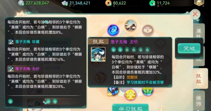 觉醒技能——落子无悔:每回合开始时,若与自身相邻的三个单位均为“黑棋”或均为“白棋”,则珍珑处于棋眼,珍珑本回合伤害抵抗增加40%(无价套且满觉醒度效果)