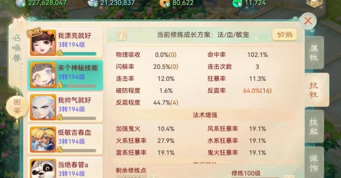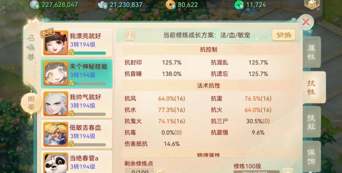 【抗性】修炼100,主要是抗仙法和反震,反震真的很重要,PK对面秒完立马躺地,相当过瘾。