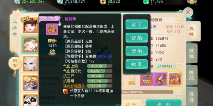 我给它带了三个无价配饰,配饰建议选的加气血百分比和反震的,多点血希望它能多站会,反震的效果大家都知道。