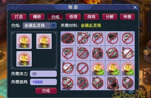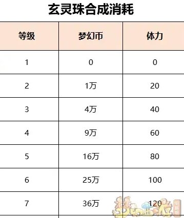 合成高级玄灵珠需消耗一定的梦幻币和体力
