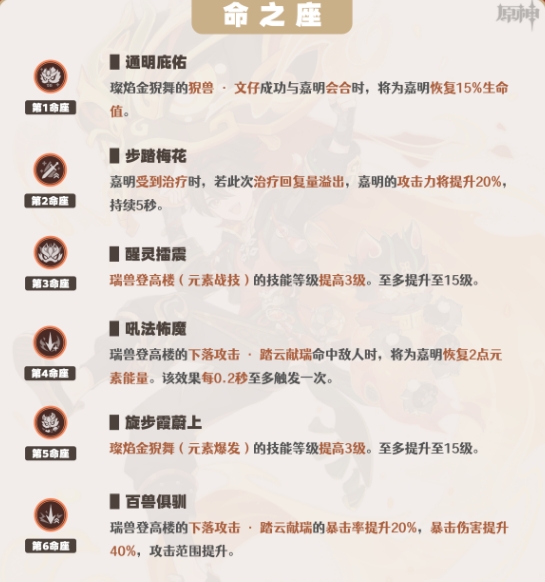 嘉明的命座提升比较平稳,0命便具备了比较完整的技能机制,也就是0命就可以作为输出角色直接体验。0命不差、1和2提升小、3提倍率、4促循环、6提伤害——可以3、4、6命为抽取目标(当然,4星角色命座越高越好)。