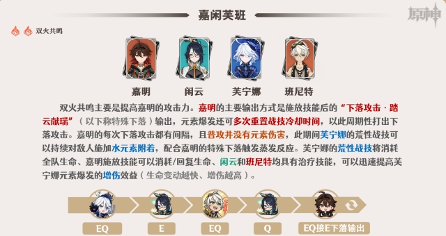 3.该队伍类似于“嘉芙闲”的降配玩法,需要一定的操作熟练度、角色练度。如果角色丰富,还是推荐优先搭配闲云、芙宁娜等角色体验嘉明的蒸发玩法。