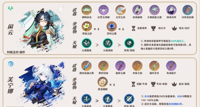 2.因为是单风入队,闲云的充能效率推荐在240%+;单水芙宁娜的充能效率推荐在240%+,双水时可在210%左右。