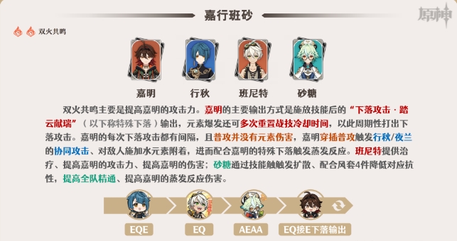 1.该组合玩法的第四人可以选择班尼特、夜兰、砂糖等提高嘉明的输出。