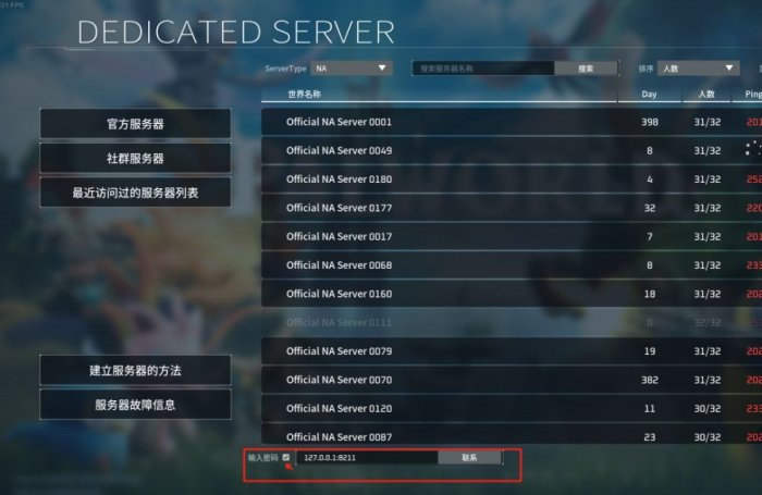 如果服务器设有密码,即服务器配置里的“ServerPassword”这一项不是空的,就需要如上图所示一样勾选“输入密码”,然后点击右边的“联系”按钮进入游戏。