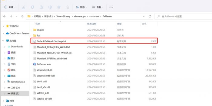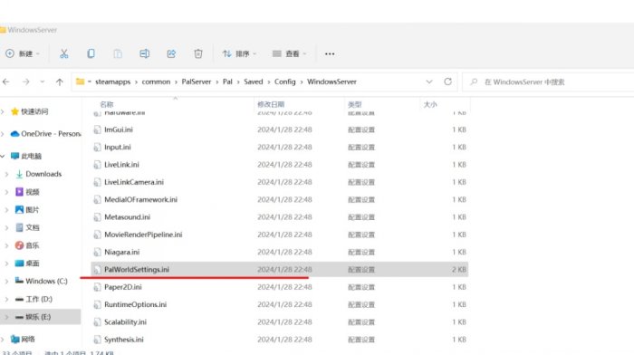 首先是配置文件路径:../steamapps/common/PalServer/Pal/Saved/Config/WindowsServer/PalWordSettings.ini