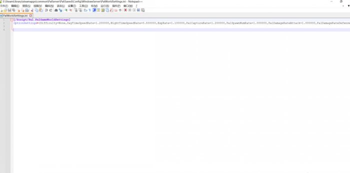 注意:不要修改参数的格式,不要添加换行,保持参数原来的格式(即如图所示参数没有换行)才能使得服务器配置有效。后面所有的PalWordSettings.ini都用“服务器配置”来指代。