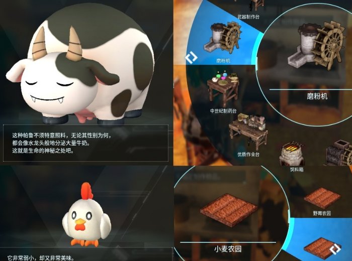 首先003号皮皮鸡放牧产出鸡蛋,029号波霸牛产出牛奶,小麦农园和野莓农园分别获得小麦和红色野莓,获得小麦后通过磨粉机制作面粉,3份小麦即可制作一份面粉;以上几只帕鲁需要玩家去初始台地,或者是出生复活点那几个岛上,捕获或者杀死皮皮鸡、波霸牛、捣蛋猫来获取材料。