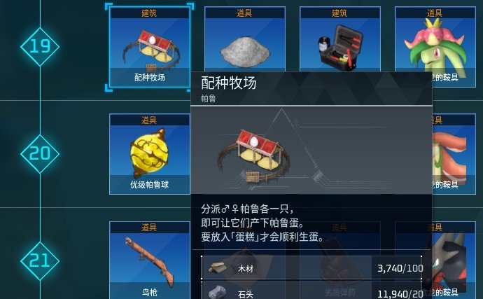 首先配种需要在19级解锁科技——配种牧场,需要100木材+20石头+50纤维,其中纤维通过粉碎机即可大量获得,配种第一个关键点是蛋糕,公母帕鲁分派进牧场后,需要将蛋糕放进牧场的箱子中,帕鲁才会顺利生蛋。