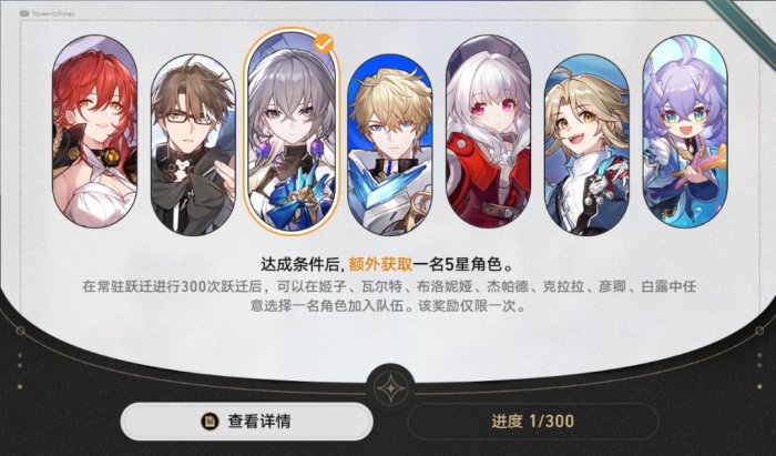 群星跃迁首次累计抽取300抽可自选获得一个常驻五星角色【只有一次,请谨慎选择】
