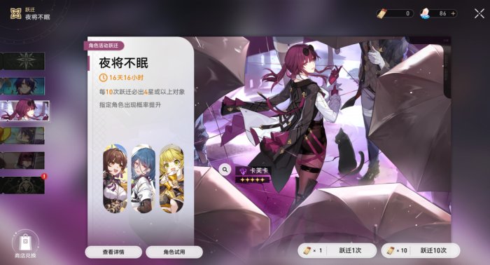 只能进行十连抽,每次十连抽必出1个四星,五次十连抽内必出1个五星。