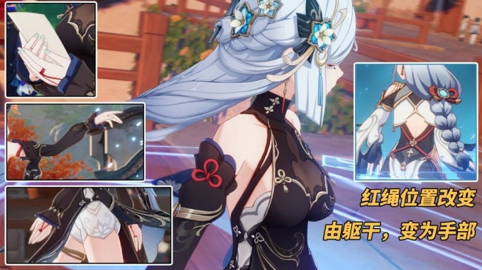 告别连体皮衣,换上更显飘逸的绸缎。原本轻置胸前的衣帘移除,替换为暗金边纹搭配半透黑纱。在元素爆发的特写下,这两套衣装此处的区别尤为明显。