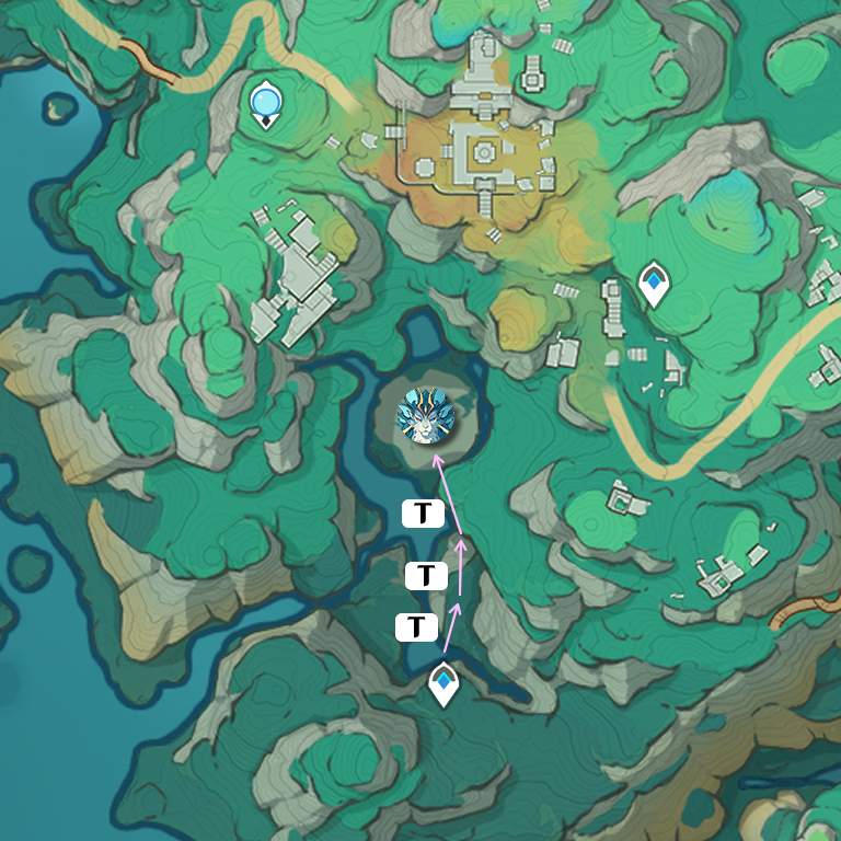 传送至赤璋城垣南部的锚点(悬练山西北)处锚点(此图最下方的锚点),往小地图北的方向平视即可发现一簇「金鲤浮跃」,向前一共有3簇(图中箭尾箭头交接处即为),利用其即可到达猊兽处: